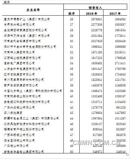 2018年我國(guó)有色金屬銷(xiāo)售收入前50名企業(yè)