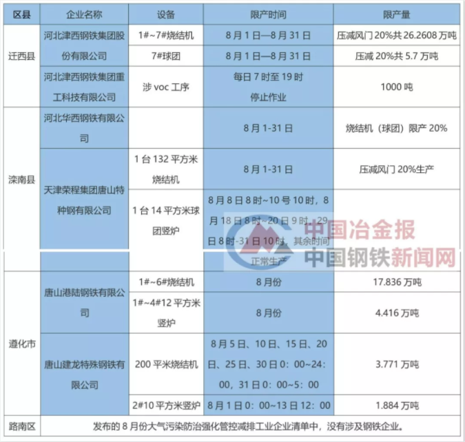 唐山部分縣區(qū)公布8月份鋼企限產(chǎn)清單