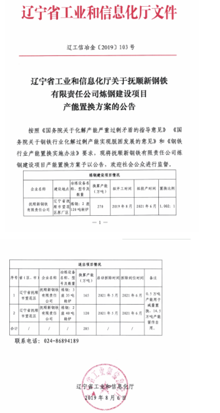 .近日,遼寧省工信廳發(fā)布關(guān)于撫順新鋼鐵有限責任公司煉鋼建設(shè)項目產(chǎn)能置換方式的公告,公司擬2019年8月新建煉鋼:2座120噸轉(zhuǎn)爐,產(chǎn)能270萬噸。具體如下: