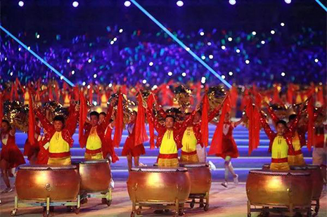 開幕式第一篇章“紅日照東方”中,太鋼威風(fēng)鑼鼓敲響了“激越時(shí)代”大型表演的序幕。兩百面威風(fēng)大鼓,兩百名鋼鐵男兒,列陣汾水兩岸。鼓聲激越,威武雄壯,太鋼威風(fēng)鑼鼓與激流勇進(jìn)的航船,共同描繪奔向新時(shí)代的美麗畫卷。