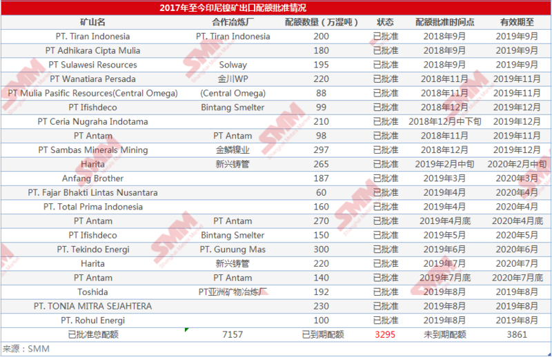 7-8月份,印尼陸續(xù)批準了5家礦山的鎳礦出口配額。截止8月13日,印尼鎳礦出口配額總量達到了7157萬濕噸,其中未到期的配額數(shù)量為3861萬濕噸。