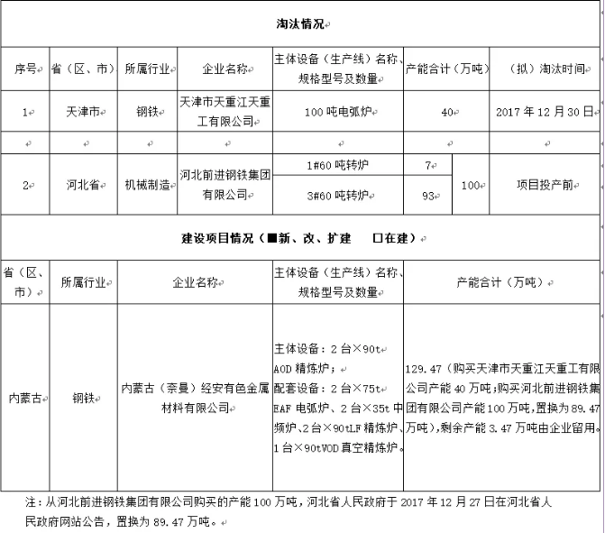 129.47萬噸產(chǎn)能分別通過購買天津市天重江天重工有限公司產(chǎn)能40萬噸置換;購買河北前進鋼鐵集團有限公司產(chǎn)能100萬噸,置換為89.47萬噸,剩余產(chǎn)能3.47萬噸由企業(yè)留用。