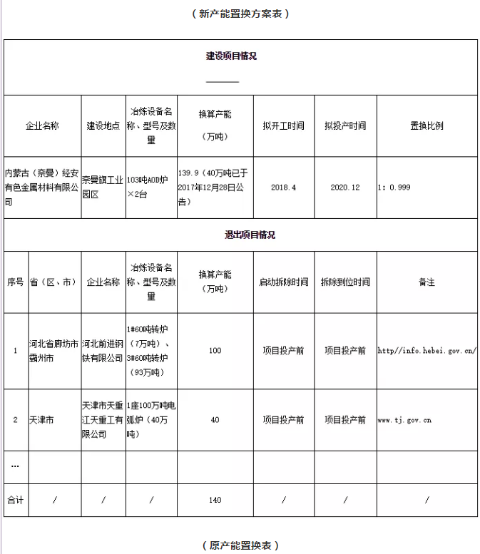 昨日,內(nèi)蒙古自治區(qū)工業(yè)和信息化廳發(fā)布關(guān)于調(diào)整內(nèi)蒙古(奈曼)經(jīng)安有色金屬材料有限公司產(chǎn)能置換方案的公告,按照《國務院關(guān)于化解產(chǎn)能嚴重過剩矛盾的指導意見》要求,內(nèi)蒙古自治區(qū)工業(yè)和信息化廳于2017年12月27日、2018年3月16日對內(nèi)蒙古(奈曼)經(jīng)安有色金屬材料有限公司建設項目產(chǎn)能置換方案予以公告。由于內(nèi)蒙古(奈曼)經(jīng)安有色金屬材料有限公司建設項目核定產(chǎn)能發(fā)生變化,現(xiàn)將調(diào)整后的產(chǎn)能置換方案進行公告。