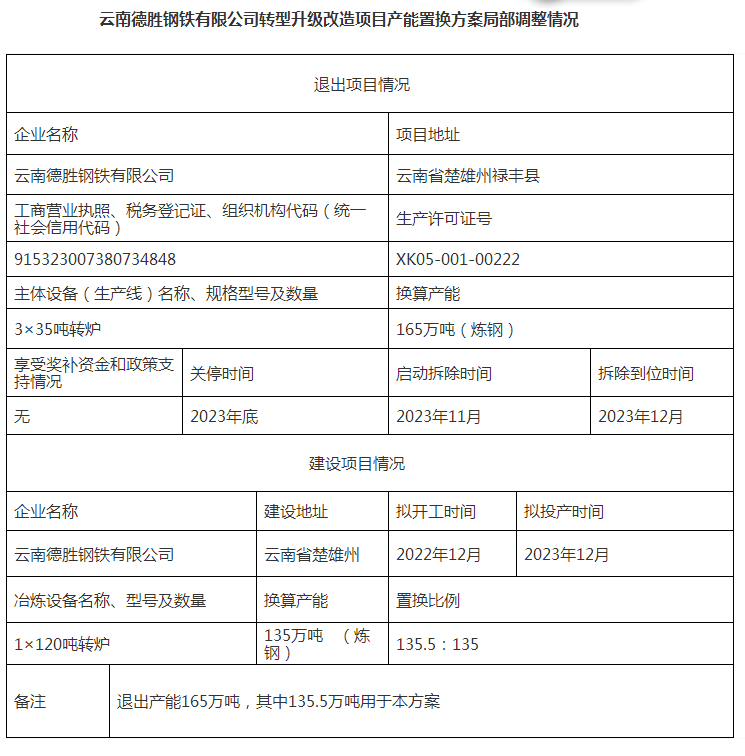云南德勝鋼鐵有限公司轉(zhuǎn)型升級(jí)改造項(xiàng)目產(chǎn)能置換方案局部調(diào)整公示