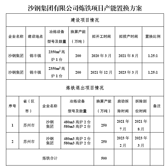 江蘇沙鋼集團(tuán)有限公司煉鐵項(xiàng)目產(chǎn)能置換方案公示