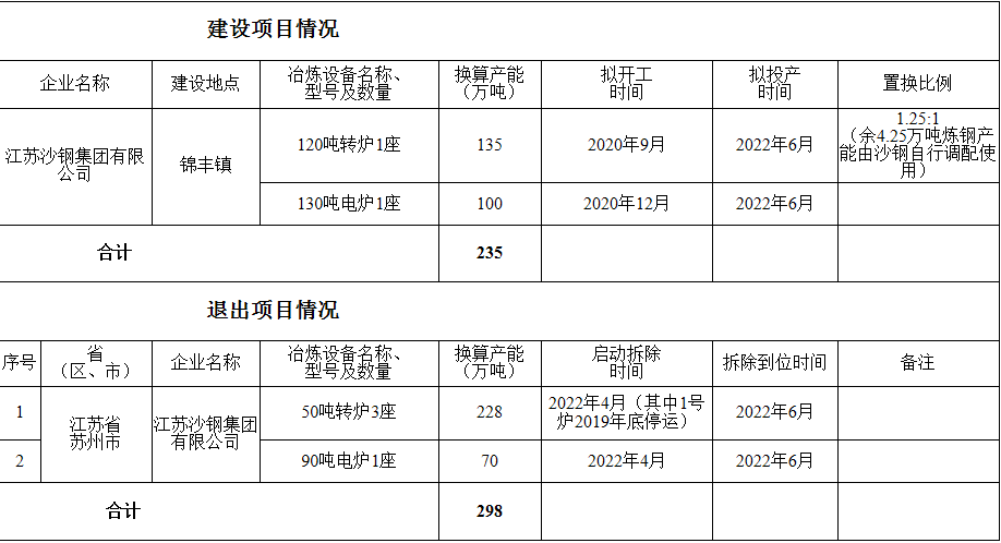 關(guān)于江蘇沙鋼集團(tuán)有限公司煉鋼項(xiàng)目產(chǎn)能置換方案的公告