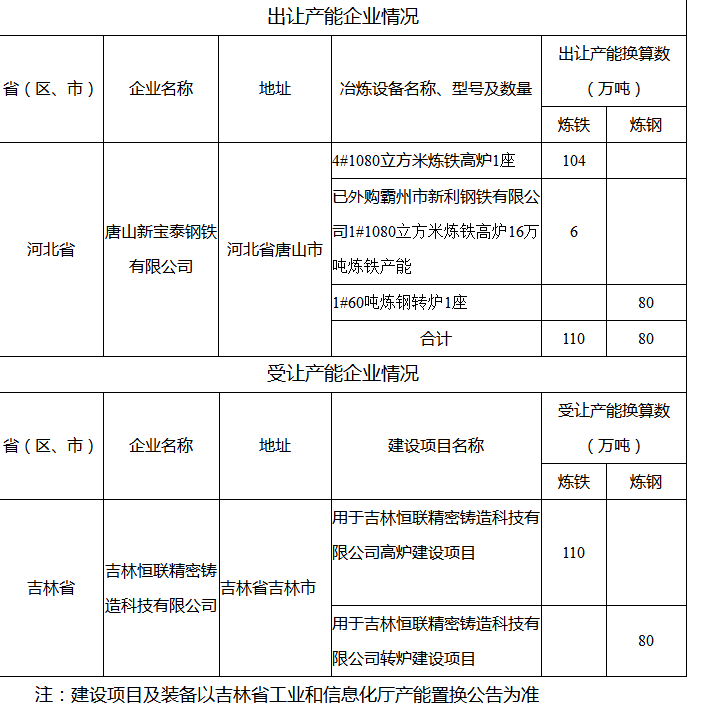 按照《國(guó)務(wù)院關(guān)于化解產(chǎn)能?chē)?yán)重過(guò)剩矛盾的指導(dǎo)意見(jiàn)》《國(guó)務(wù)院關(guān)于鋼鐵行業(yè)化解過(guò)剩產(chǎn)能實(shí)現(xiàn)脫困發(fā)展的意見(jiàn)》和《鋼鐵行業(yè)產(chǎn)能置換實(shí)施辦法》要求,現(xiàn)將唐山新寶泰鋼鐵有限公司產(chǎn)能出讓方案予以公示,歡迎社會(huì)公眾進(jìn)行監(jiān)督。公示期為2020年1月13日至2020年2月12日。