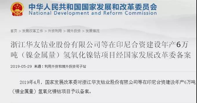 2019年4月,國(guó)家發(fā)展改革委對(duì)浙江華友鈷業(yè)股份有限公司等在印尼合資建設(shè)年產(chǎn)6萬(wàn)噸(鎳金屬量)氫氧化鎳鈷項(xiàng)目予以備案。