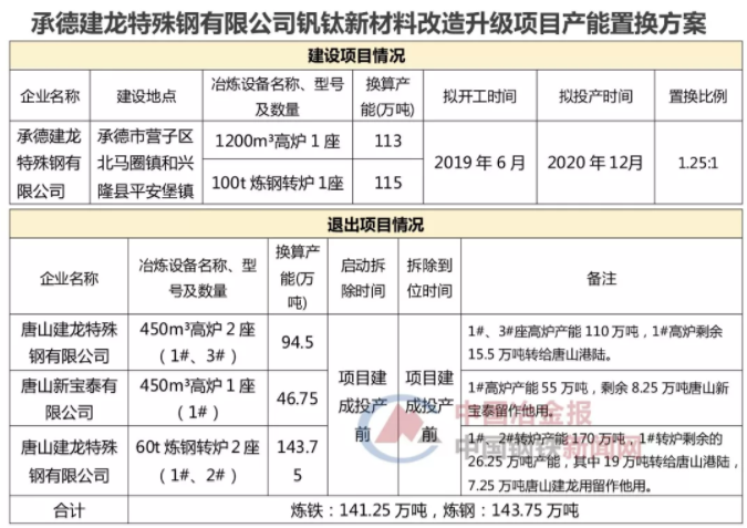 6月13日,河北省工業(yè)和信息化廳發(fā)布了《承德建龍?zhí)厥怃撚邢薰锯C鈦新材料改造升級項目產(chǎn)能置換方案公示》(以下簡稱“《公示》”)。從《公示》中獲悉,承德建龍?zhí)厥怃撚邢薰緮M新建煉鐵產(chǎn)能113萬噸、煉鋼產(chǎn)能115萬噸,該產(chǎn)能置換還涉及唐山新寶泰有限公司,具體情況如下——
