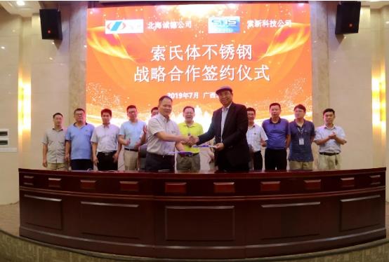 7月4日,北海誠德公司與前海索新發(fā)展科技公司在106多功能廳舉行索氏體不銹鋼戰(zhàn)略合作簽約儀式。前海索新發(fā)展科技公司董事長董書通、原全國鋼鐵標準委員會主任張宇春、佛山市金屬材料行業(yè)協(xié)會執(zhí)行會長李強、無錫誠棟不銹鋼有限公司副總經(jīng)理邵毛忠;北海誠德公司黨委書記、董事長、總經(jīng)理黃慶周、常務(wù)副總經(jīng)理梁偉森、副總經(jīng)理潘料庭等出席了本次簽約活動。