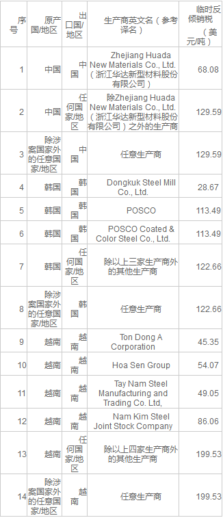 2019年7月15日,印度商工部發(fā)布公告,對(duì)原產(chǎn)于或進(jìn)口自中國(guó)、韓國(guó)和越南的鍍鋁鋅合金扁軋鋼產(chǎn)品(Aluminium and Zinc Coated Flat Products)作出反傾銷(xiāo)肯定性初裁,建議對(duì)涉案產(chǎn)品征收臨時(shí)反傾銷(xiāo)稅:中國(guó)涉案產(chǎn)品為68.08~129.59美元/噸,韓國(guó)為28.67~122.66美元/噸,越南為45.35~199.53美元/噸,具體措施詳見(jiàn)下表。本案涉及印度稅號(hào)72106100、72125090、72259900和72269990項(xiàng)下的產(chǎn)品以及稅號(hào)72101290、72103090、72104900、72106900、72107000、72109090、72121090、72122090、72123090、72124000、72169910、72255010、72259100、72259200和72269930等項(xiàng)下的部分產(chǎn)品。