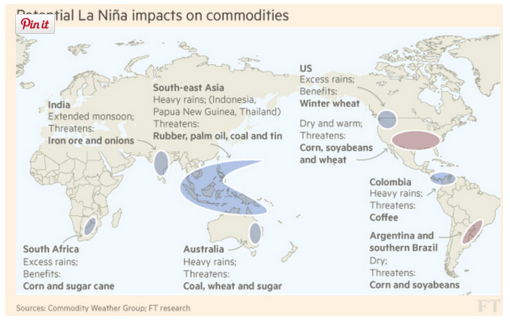 下圖可見(jiàn)拉尼娜可能對(duì)各地大宗商品產(chǎn)地的影響。