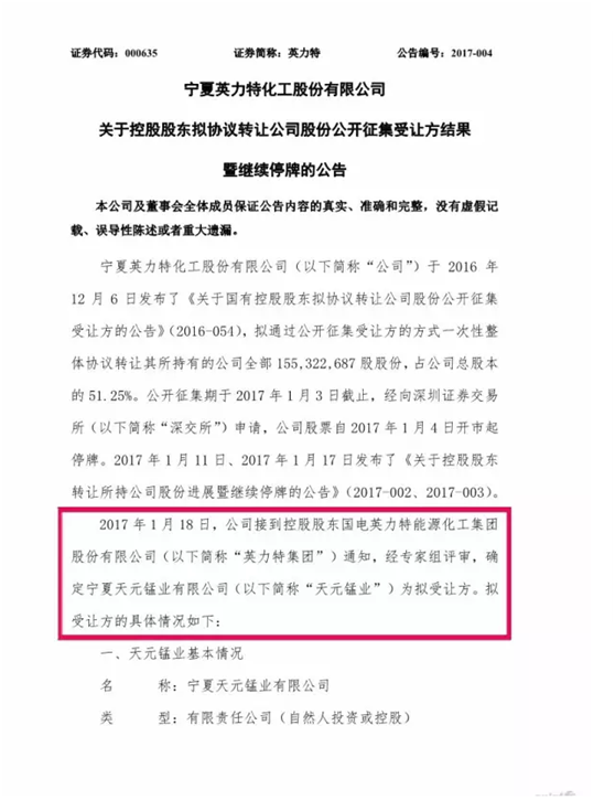 中國(guó)鐵合金網(wǎng)訊:1月18日, 寧夏主板上市企業(yè)英力特(000635)發(fā)布公告,公司接到控股股東國(guó)電英力特能源化工集團(tuán)股份有限公司通知,經(jīng)專(zhuān)家組評(píng)審,確定寧夏天元錳業(yè)有限公司(以下簡(jiǎn)稱(chēng)“天元錳業(yè)”)為股權(quán)轉(zhuǎn)讓的擬受讓方。因還需履行審核程序,公司申請(qǐng)繼續(xù)停牌。