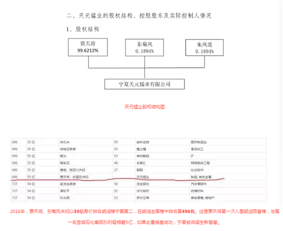 天元錳業(yè)是全球最大的電解金屬錳生產(chǎn)企業(yè)。資料顯示,天元錳業(yè)2003年成立,注冊(cè)資本26.4億元,股東為3名自然人。其中賈天將持股99.6212%,東菊鳳、朱鳳蓮二人各持有0.1894%股份,而賈天將與東菊鳳系夫妻關(guān)系。