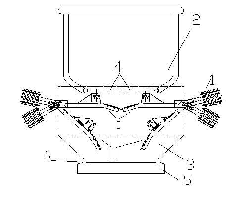 焦罐裝焦時,間斷產(chǎn)生陣發(fā)性煙塵外溢,給現(xiàn)場職工及周圍環(huán)境、設(shè)備帶來影響。車間技術(shù)人員,經(jīng)過外出考察、操作實踐,對裝入裝置進行改造,在裝入裝置上料斗增加了兩塊活動蓋板。如圖2所示,1為除塵蓋板,2為焦罐,3為裝入裝置料斗,4為焦罐底閘門,5為水封罩,6為耐高溫石棉布。蓋板有Ⅰ和Ⅱ兩個狀態(tài),焦罐裝焦時落在裝入裝置料斗支座上,并與支座一起下降一段距離,焦罐底閘門靠重力自動打開,同時蓋板受焦罐底閘門重力作用打開,此時蓋板處于狀態(tài)Ⅱ,裝焦完成焦罐提起,蓋板靠配重作用自動合攏,此時處于狀態(tài)Ⅰ,避免了裝焦過程中粉塵大量外溢,并且因蓋板的增加,增強了密封性,提高了除塵風(fēng)機的吸力,起到了良好的除塵效果。