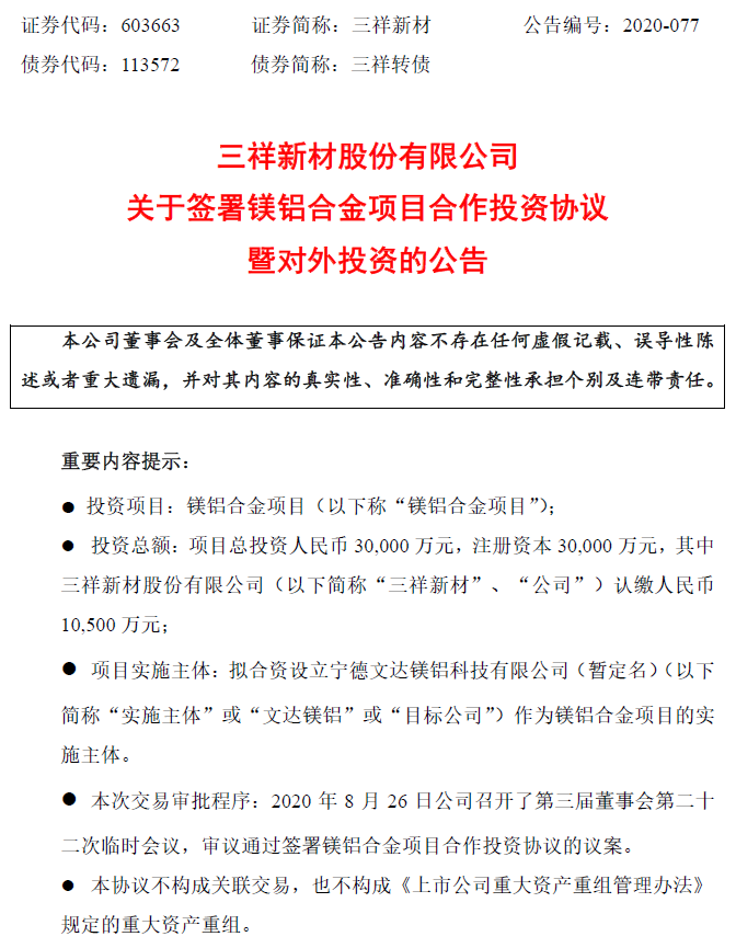 各方同意根據(jù)《投資協(xié)議》的條款和條件合作投資鎂鋁合金項(xiàng)目,該項(xiàng)目總投資金額為3億元。