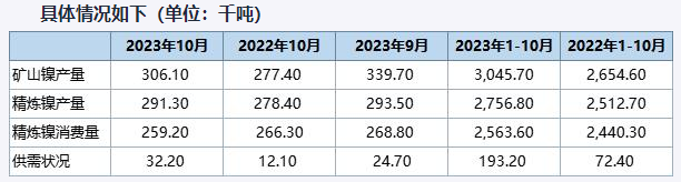 國際鎳業(yè)研究組織(INSG)公布的數(shù)據(jù)顯示,全球鎳市場10月份供應過剩32200噸,去年同期為過剩12100噸,9月為過剩24700噸。2023年1—10月,市場供應過剩193200噸,去年同期為過剩72400噸。