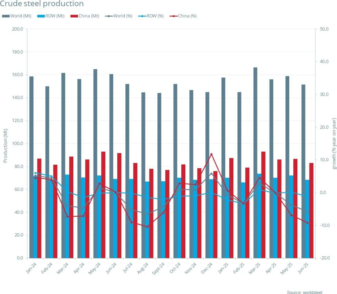 [導(dǎo)讀]2025年6月全球70個納入世界鋼鐵協(xié)會統(tǒng)計(jì)國家/地區(qū)的粗鋼產(chǎn)量為1.514億噸,同比下5.8%。
