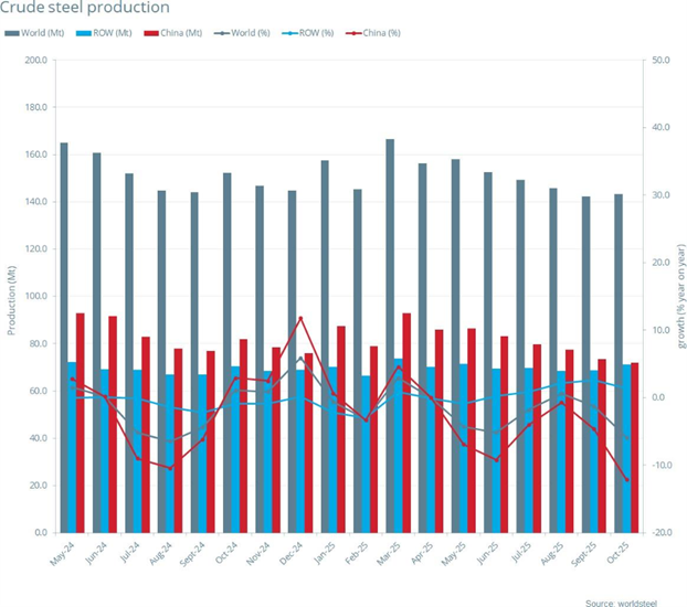 [導(dǎo)讀]2025年10月全球70個納入世界鋼鐵協(xié)會統(tǒng)計國家/地區(qū)的粗鋼產(chǎn)量為1.433億噸,同比下降5.9%。