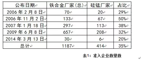 引言:我國(guó)硅錳廠家處于數(shù)量多、單個(gè)企業(yè)產(chǎn)能小、產(chǎn)業(yè)集中度偏低的情況。國(guó)家發(fā)改委及工信部已批準(zhǔn)的符合我國(guó)《鐵合金行業(yè)準(zhǔn)入條件》的鐵合金企業(yè)總數(shù)為1187家(見(jiàn)表1),其中生產(chǎn)硅錳合金廠家有414家(第一批20家、第二批67家、第三批113家、第四批208家、第五批6家),占國(guó)內(nèi)鐵合...