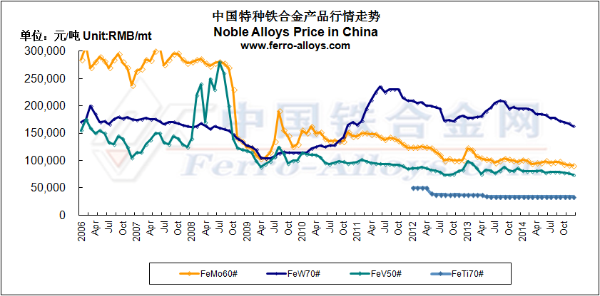 2006-2014特種鐵合金產(chǎn)品(鉬鐵 鎢鐵 釩鐵 鈦鐵)價格走勢圖