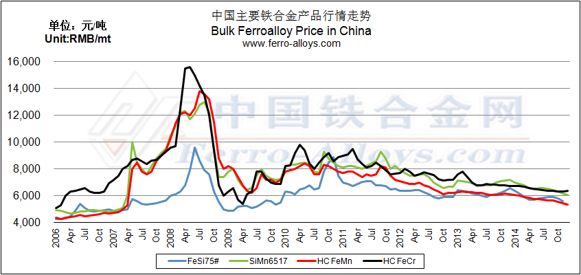 2006-2014大宗鐵合金產(chǎn)品(硅鐵 硅錳 錳鐵 鉻鐵)價格走勢圖