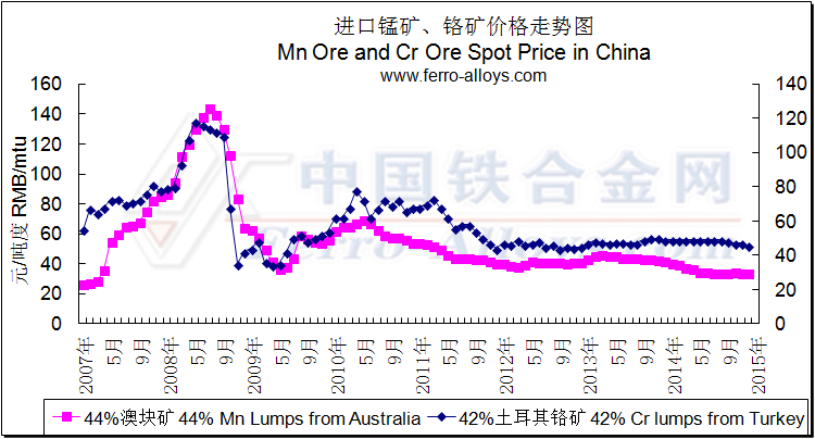 2007-2014主要礦產(chǎn)品(錳礦 鉻礦)價格走勢圖