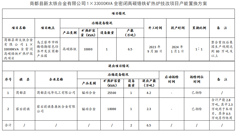關(guān)于商都縣新太鐵合金有限公司1×33000KVA全密閉高碳鉻鐵礦熱爐技改項(xiàng)目產(chǎn)能置換方案的公告