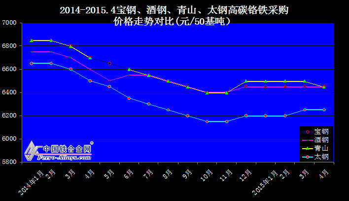 2014-2015.4寶鋼、酒鋼、青山、太鋼高碳鉻鐵采購(gòu)價(jià)格走勢(shì)對(duì)比(元/50基噸)
