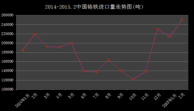 2014-2015.2中國(guó)鉻鐵進(jìn)口量走勢(shì)圖