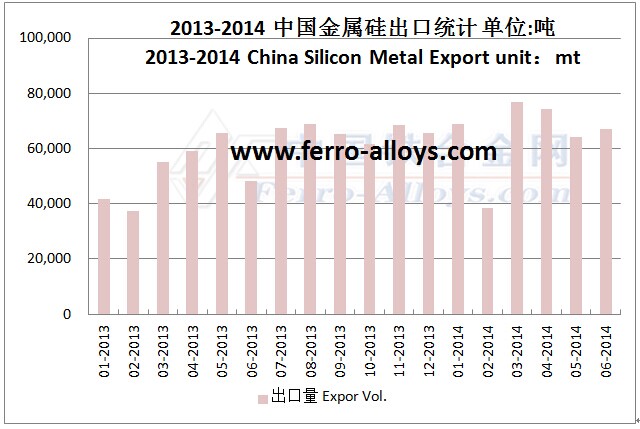 2013年,中國累計出口金屬硅數量為704280噸,同比上漲46.7%;2014年1-6月,中國累計出口金屬硅389,898噸,同比上漲27.2%。