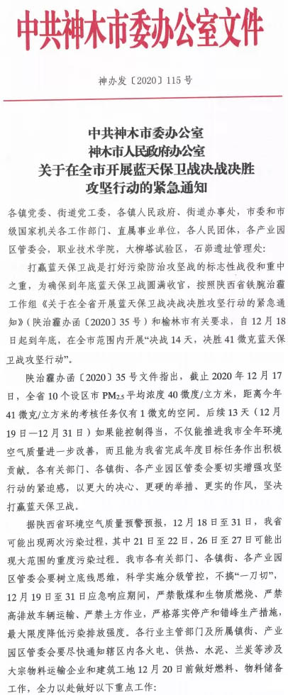 神木市關(guān)于開展藍天保衛(wèi)戰(zhàn)決戰(zhàn)決勝攻堅行動的緊急通知