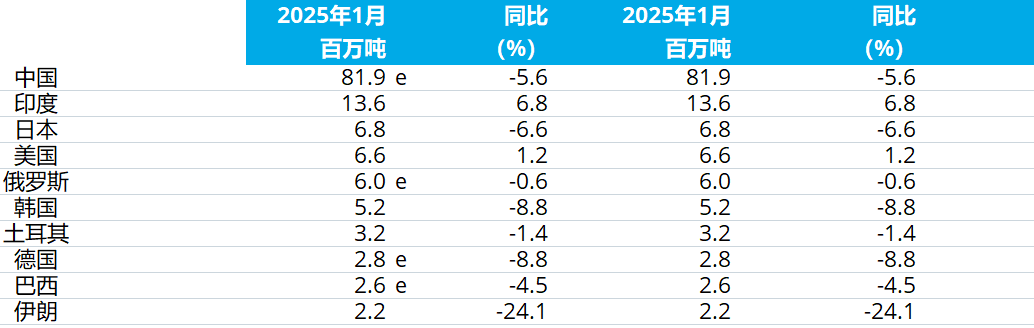 2025年1月全球69個(gè)納入世界鋼鐵協(xié)會(huì)統(tǒng)計(jì)國(guó)家/地區(qū)的粗鋼產(chǎn)量為1.514億噸,同比下降4.4%。