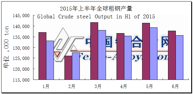 2015年上半年全球粗鋼產(chǎn)量統(tǒng)計