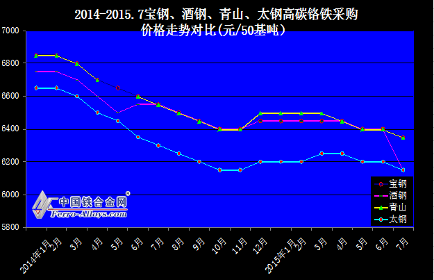 2014-2015.7寶鋼、酒鋼、青山、太鋼高碳鉻鐵采購價格走勢對比(元/50基噸)