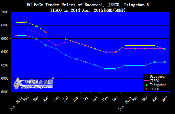 [Ferro-Alloys.com]Tender prices of high-carbon ferrochrom of China's major stainless steel producers, including TISCO, JISCO, Baosteel and Tsingshan Group, have been settled. JISCO, TISCO and Baosteel kept their tender prices the same from the previous month, while Tsingshan Group lowered its high-carbon ferrochrome tender price and cut its purchasing amount in April 2015. The current tender prices remained the same for about 5 months after the rebound at the end of 2014, which has formed a strong resistance. Meanwhile, tender prices of some major stainless steel producers in different areas concentrated again in April 2015.