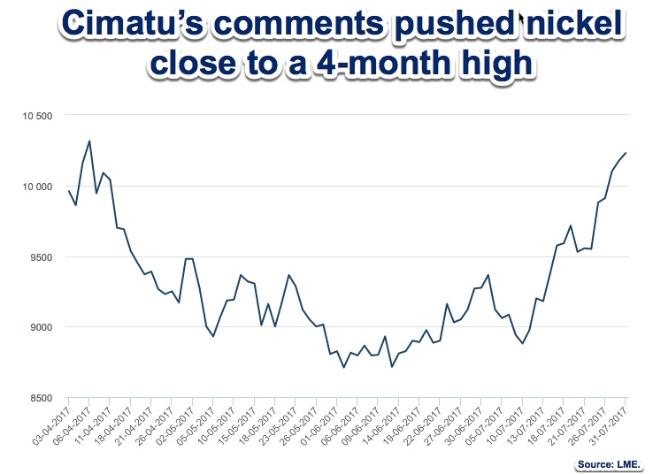 The Southeast Asian nation is the world's top nickel ore supplier, so the ongoing crackdown on its mining sector has caused prices of the metal to spike. On Monday nickel hit a near four-month high after Cimatu’s comments, helped also by soaring steel prices. It ended up 0.1% at $10,270, having earlier hit its highest since early April at $10,355.