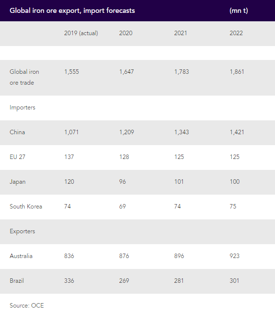China's iron ore demand is expected to remain high over the next 12 months, although Chinese steelmakers may seek to reduce production slightly should iron ore prices remain at a level that renders many of them unprofitable, the OCE said. Demand in many other countries is expected to stay below its 2019 level, with range of steelmakers in Europe and south Asia remaining on hiatus or shut down and not expected to return to production until iron ore prices drop.