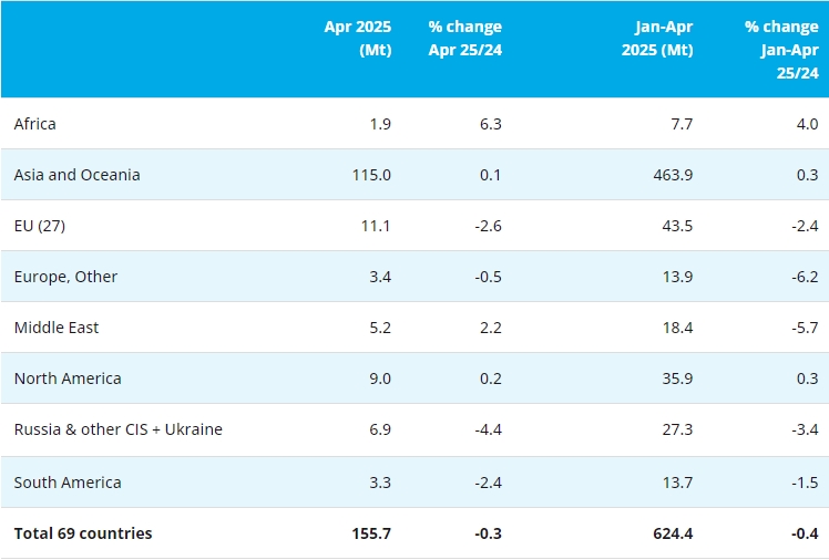 Africa produced 1.9 Mt in April 2025, up 6.3% on April 2024. Asia and Oceania produced 115.0 Mt, up 0.1%. The EU (27) produced 11.1 Mt, down 2.6%. Europe, Other produced 3.4 Mt, down 0.5%. The Middle East produced 5.2 Mt, up 2.2%. North America produced 9.0 Mt, up 0.2%. Russia & other CIS + Ukraine produced 6.9 Mt, down 4.4%. South America produced 3.3 Mt, down 2.4%.