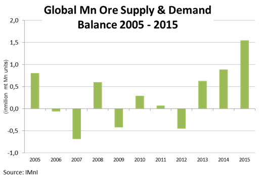 Mn ore supply in 2015: -14% over 2014, to 16.4 million mt (Mn units). Meanwhile, demand: -19% YoY, to 14.9 million mt (Mn units).Globally, around 11.7 million mt of Mn ore capacity cuts have been announced at the end of 2015 and beginning of 2016, due to low M... |