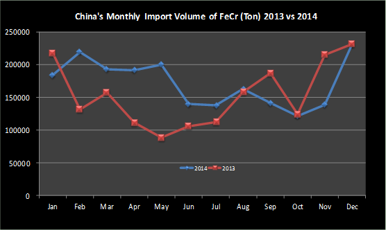[Ferro-Alloys.com]China imported about 1.84 million tonnes of ferrochrome in 2013, and the import volume of ferrochrome in 2014 totaled 2.06 million tonnes, up 11.8%。