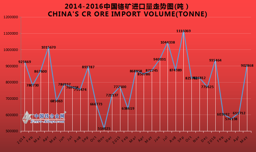 [Ferro-Alloys.com]China's chrome ore import totals 902,868 tonnes in May, up 47.6% over the previous month, |