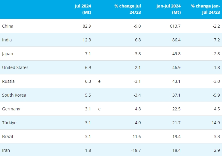 World crude steel production for the 71 countries reporting to the World Steel Association (worldsteel) was 152.8 million tonnes (Mt) in July 2024, a 4.7% decrease compared to July 2023.